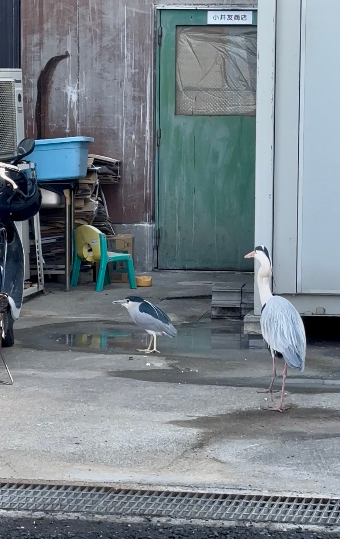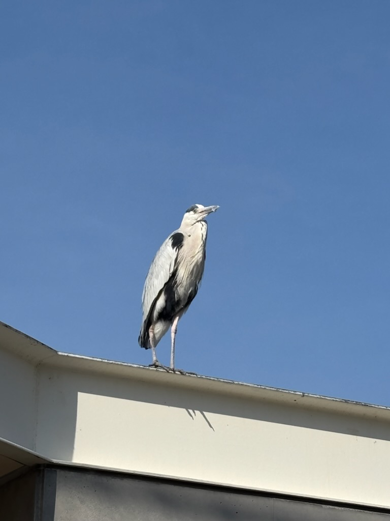 トイレや建物の上にはアオサギの仲間の鳥が、漁師さんからのおこぼれを待っています。