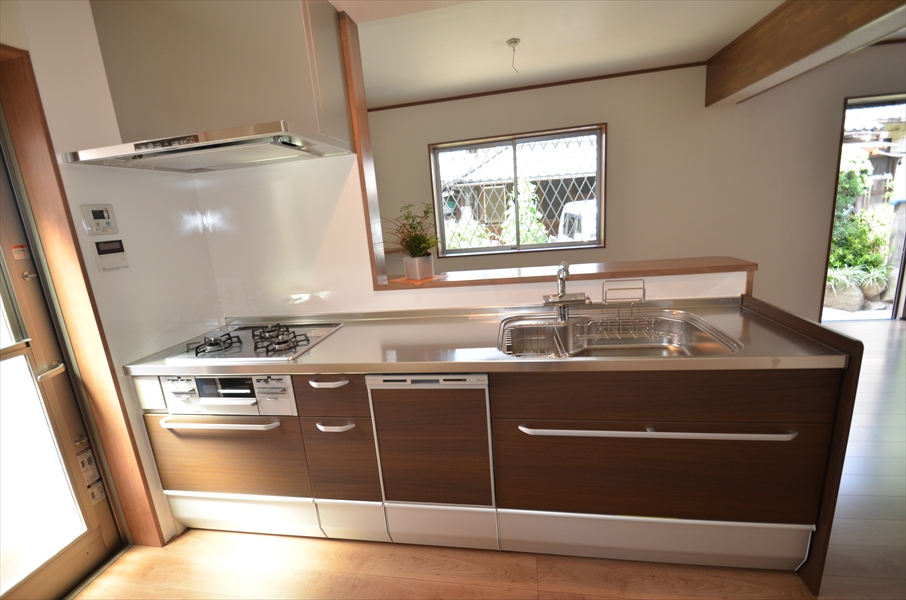 2階にあったキッチンを、1階の倉庫があった場所に移設しました。 ステンレスキャビネット、レンジフードの洗エール流レールシンク、 おそうじラクラクのクリナップ、クリンレディです。