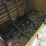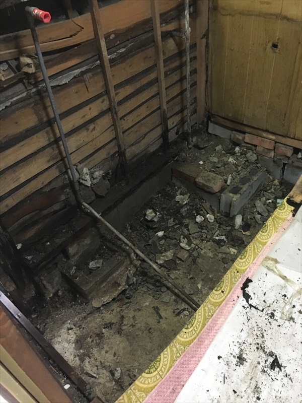 キッチンをはずしてみると、水道管からの漏水で、柱、壁、床が水腐れを起こしていました。